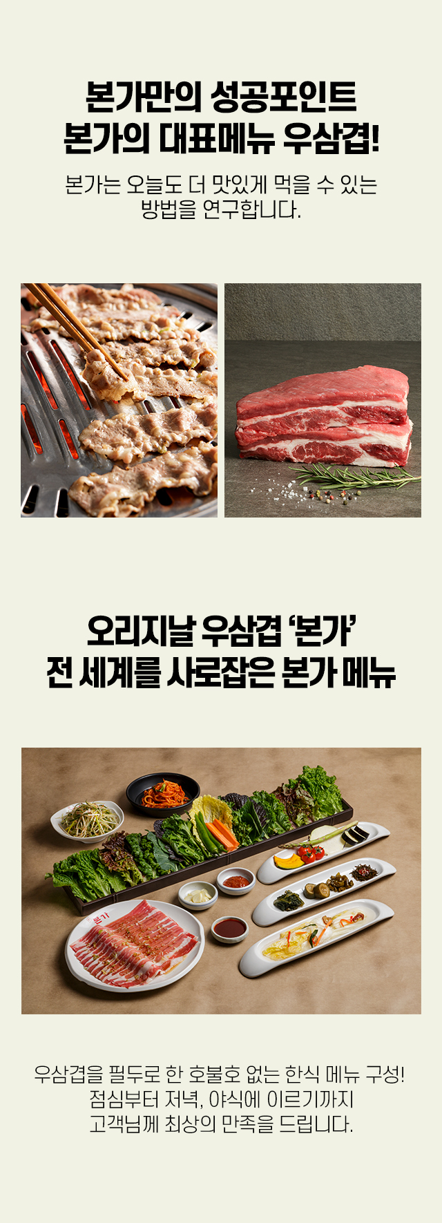 우삼겹을 필두로 한 호불호 없는 한식 메뉴 구성! 점심부터 저녁, 야식에 이르기까지 고객님께 최상의 만족을 드립니다.