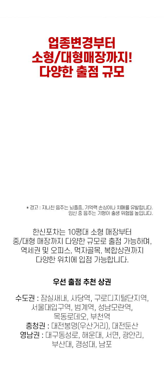 한신포차는 10평대 소형 매장부터 중/대형 매장까지 다양한 규모로 출점 가능하며, 역세권 및 오피스, 먹자골목, 복합상권까지 다양한 위치에 입점 가능합니다.
