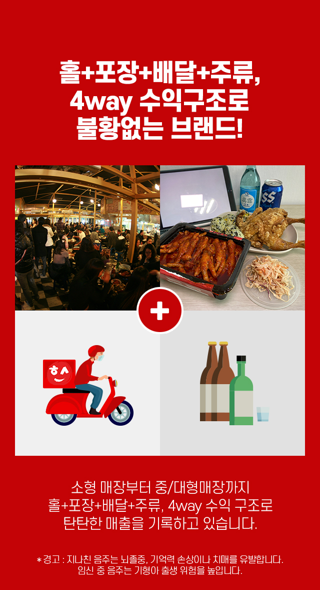 소형 매장부터 중/대형매장까지 홀+포장+배달+주류, 4way 수익 구조로 탄탄한 매출을 기록하고 있습니다.