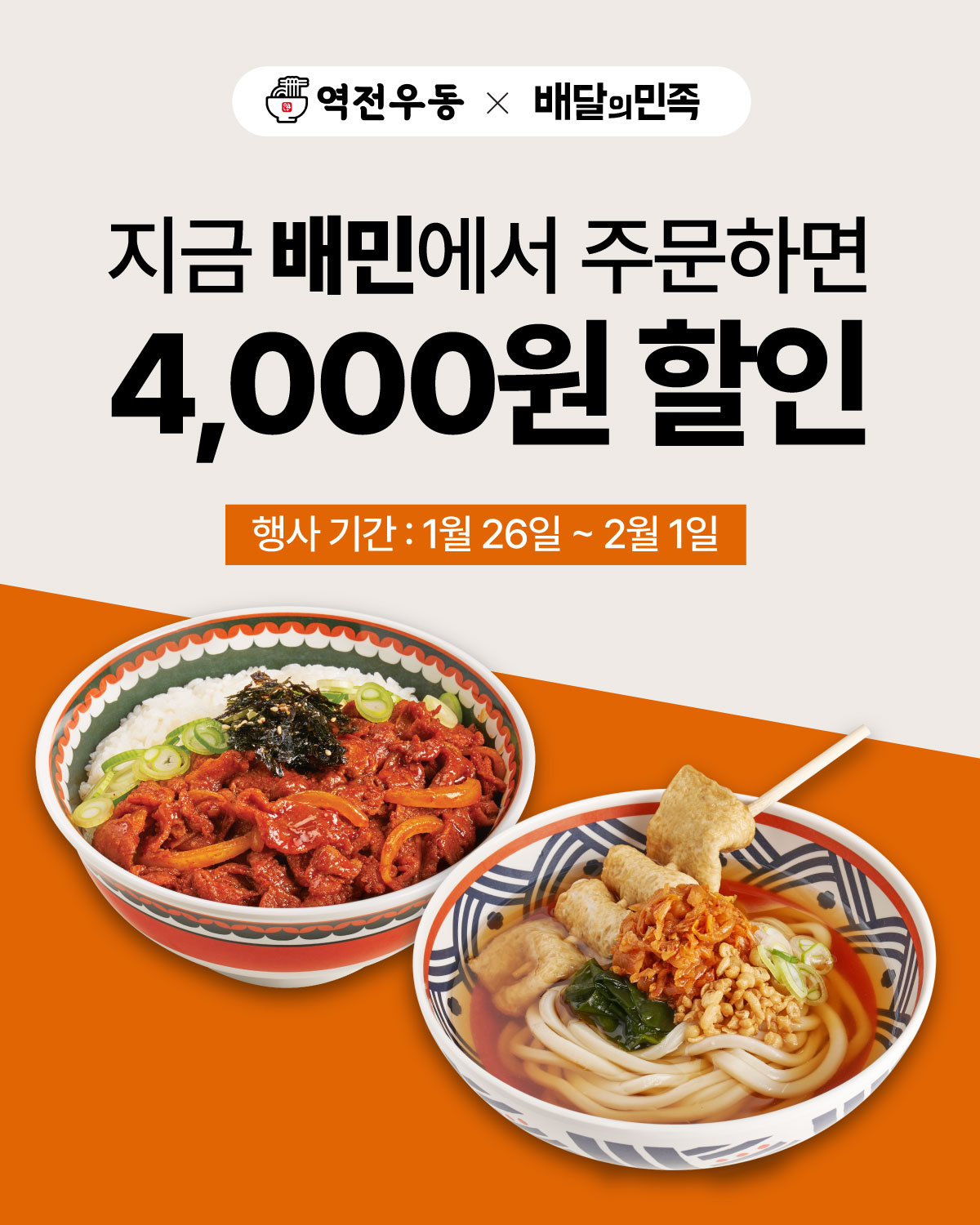 - 1월 26일~2월 1일까지 ‘배달의민족’ 통해 역전우동 메뉴 주문 시 4,000원 할인 혜택 제공