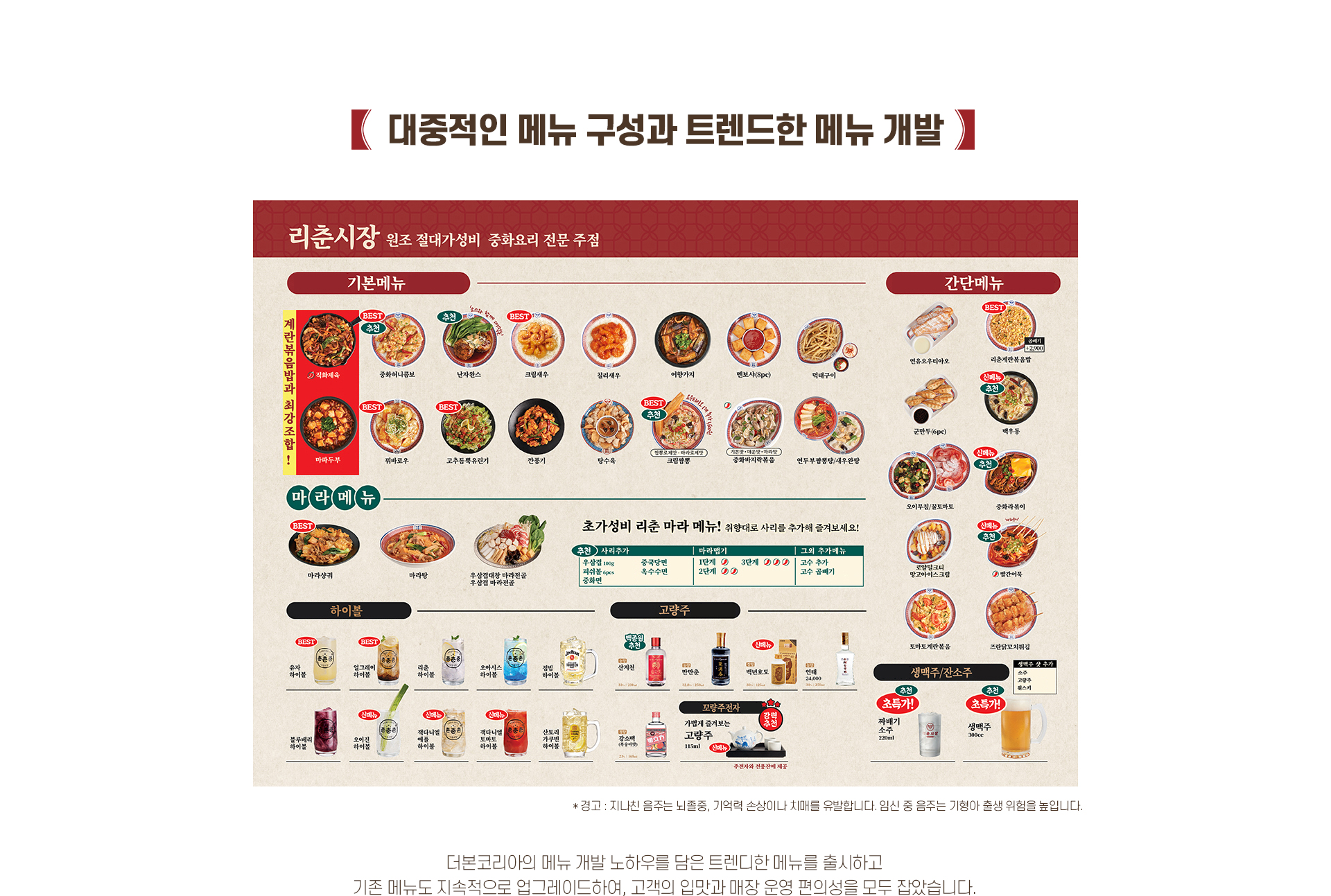 난이도 높은 고급 중식요리를 더본코리아의 프랜차이즈 운영 노하우로 합리적인 가격과 초간단 메뉴얼로 제공하여 주방장 의존도를 낮췄습니다.