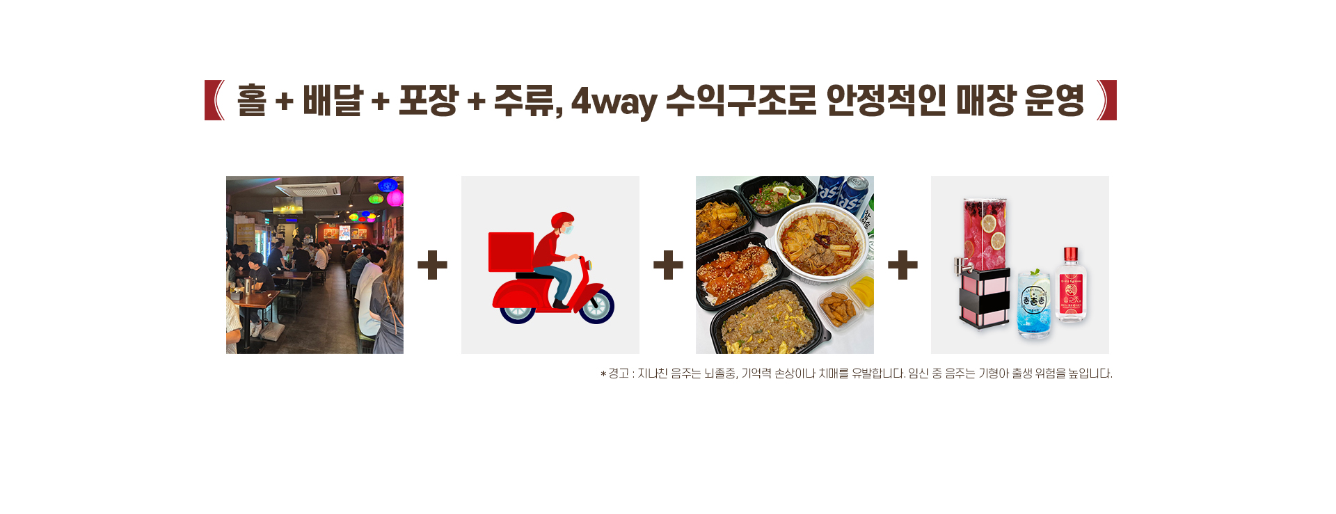 식사가 가능한 메인 메뉴부터 주류 매출 극대화를 위한 안주까지 다양하여 한 끼 식사와 술이 한 번에 가능해 안정적인 매출 확보가 가능합니다.