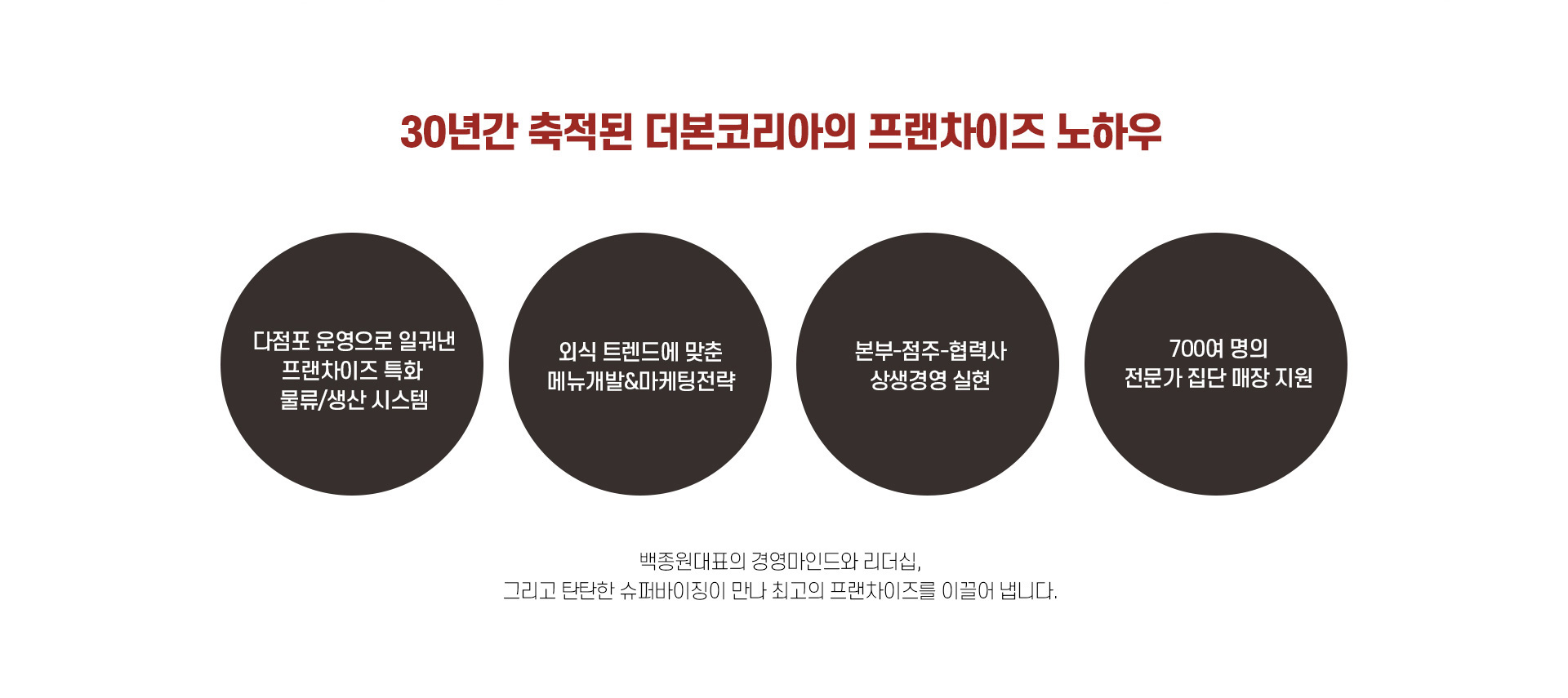 백종원대표의 경영마인드와 리더십, 그리고 탄탄한 슈퍼바이징이 만나 최고의 프랜차이즈를 이끌어 냅니다.