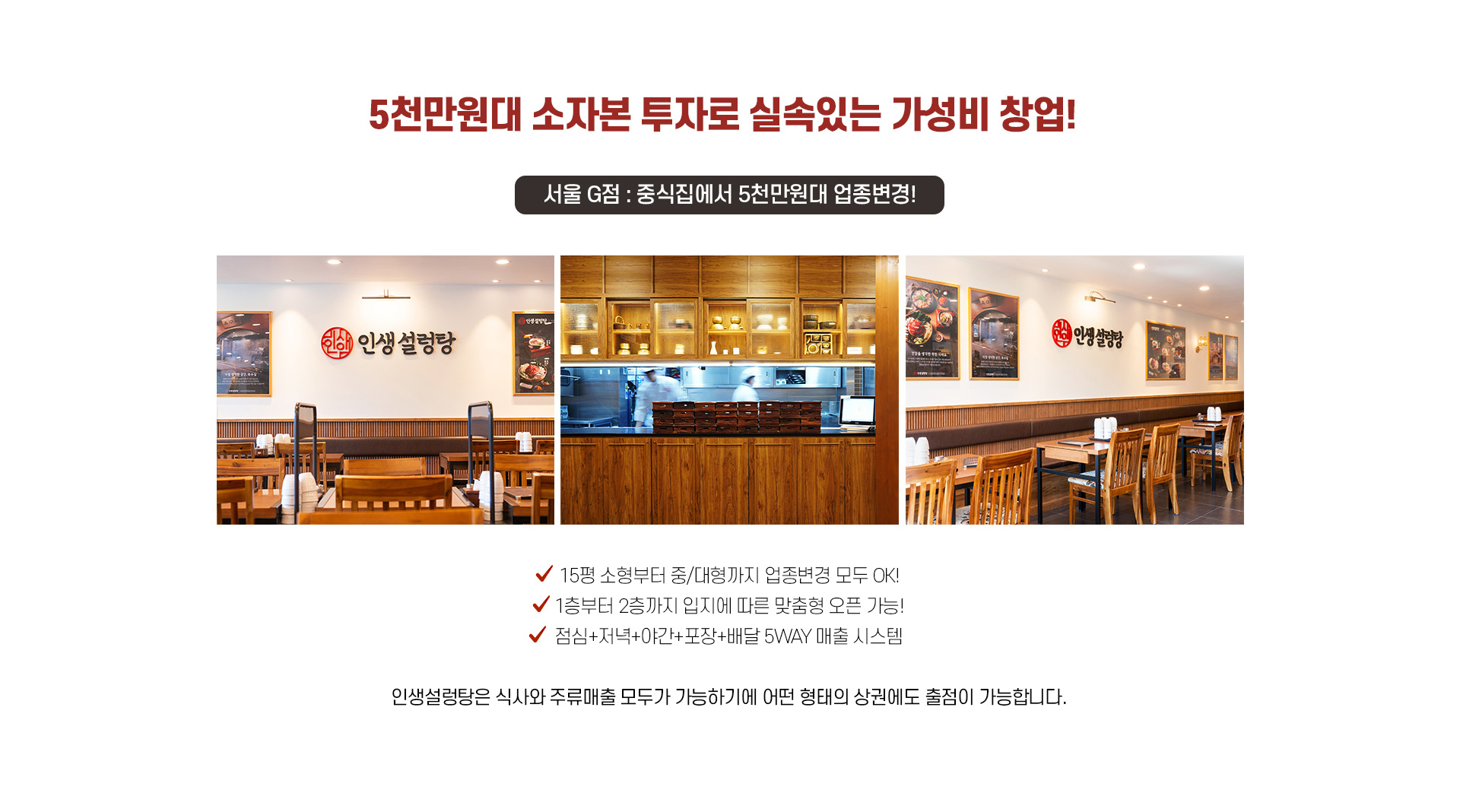 인생설렁탕은 식사와 주류매출 모두가 가능하기에 어떤 형태의 상권에도 출점이 가능합니다.