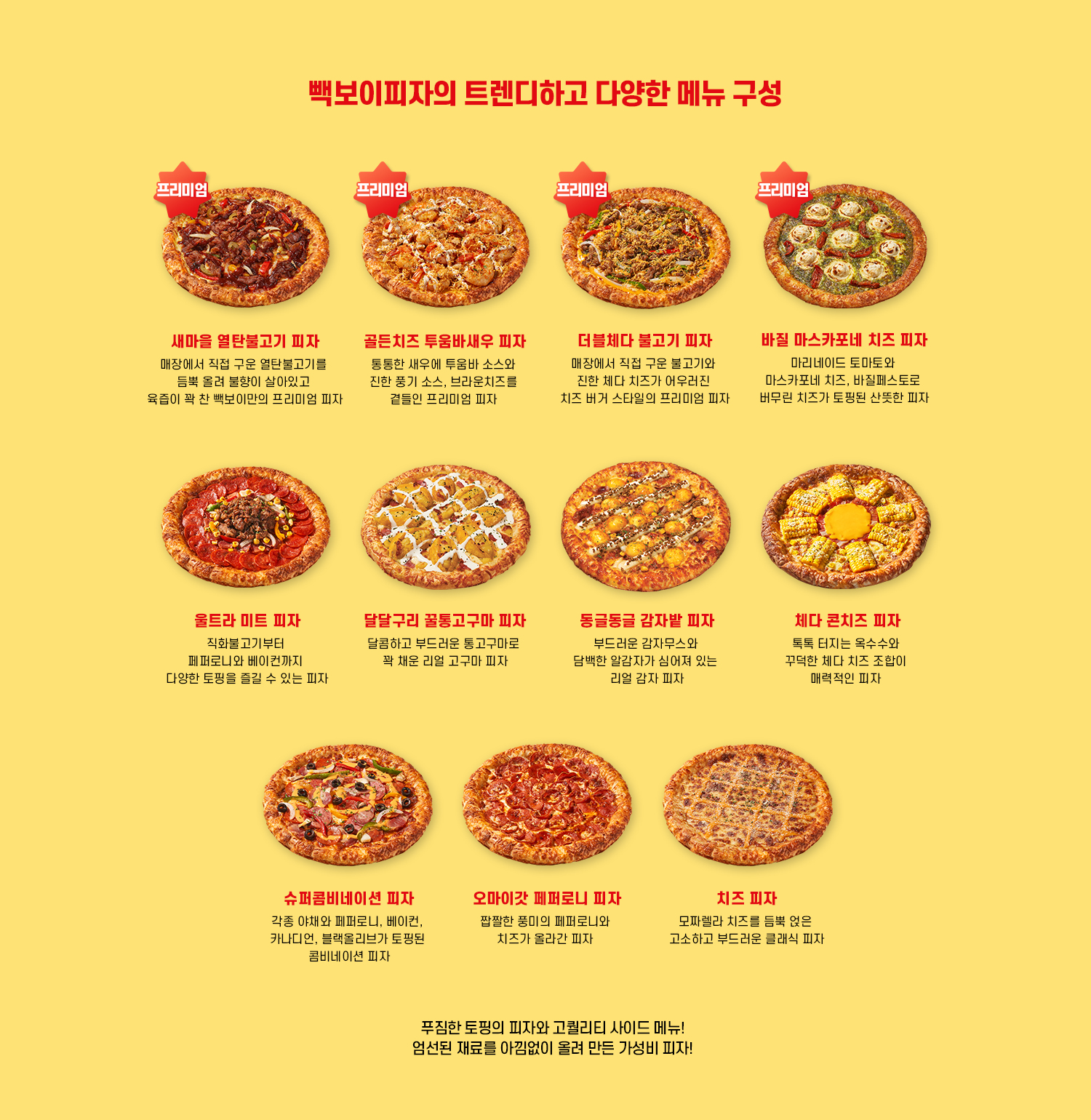 푸짐한 토핑의 피자와 고퀄리티 사이드 메뉴! 엄선된 재료를 아낌없이 올려 만든 가성비 피자!